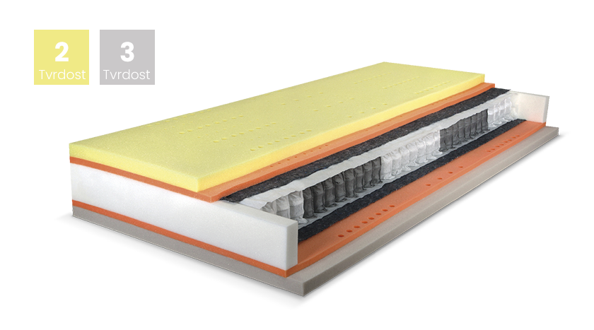 Vysoká matrace s jádrem ze stovek taštičkových pružin v kombinaci s vysoce komfortní HR studenou pěnou a Visco pěnou. Reakce Visco pěny na teplotu lidského těla zaručuje unikátní pocit při ležení. Dokonalého odvětrání je dosaženo děrováním technologií ŘEŠETO.