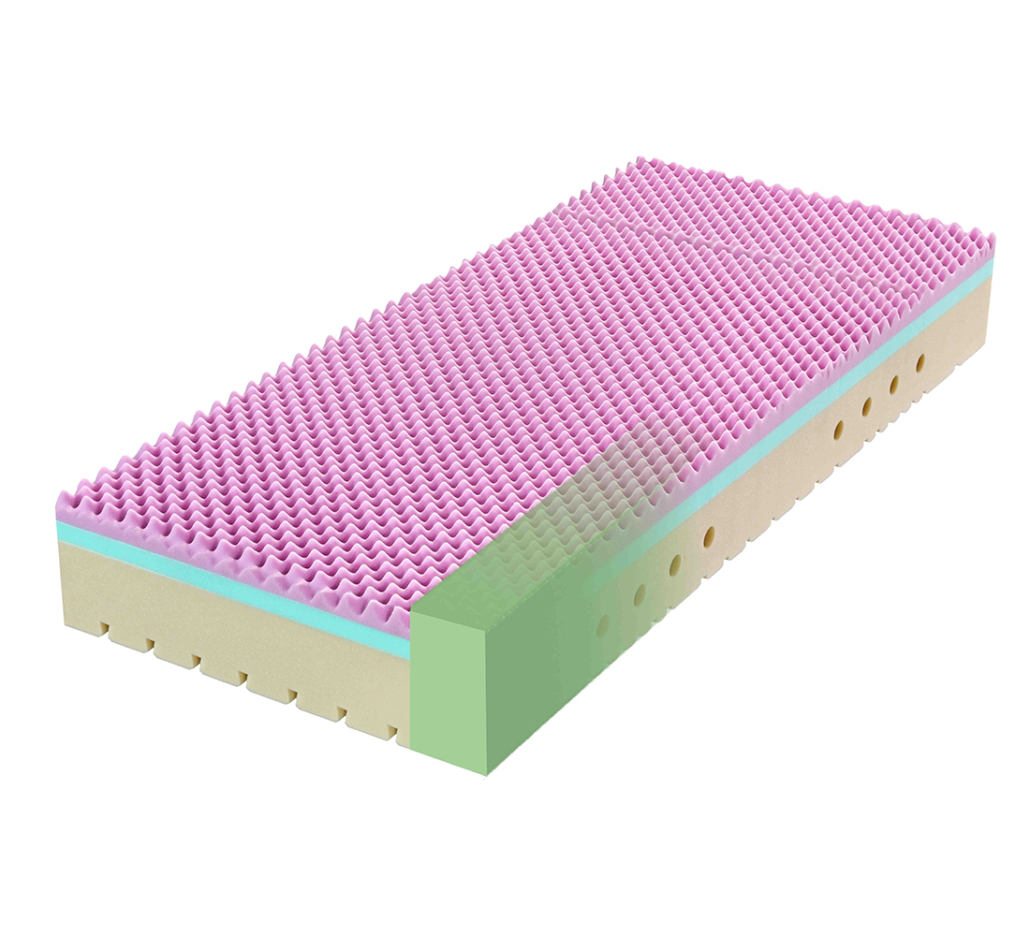 • Studená pěna (strana hard) Vynikající prodyšnost díky otevřenější buněčné struktuře, nízké povrchové teplotní napětí (nepřehřívá). Vysoká odrazová pružnost, zvýšená tuhost a odolnost.