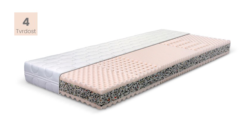 5-zónová matrace z kvalitních pěn zajišťuje anatomicky správný a velmi dobrý spánkový komfort. Oboustranné jádro matrace je složeno z desky kvalitního odlehčeného polyuretanu a po obou stranách tvořeny masážními deskami z vysoce kvalitní pěny tuhosti 25 kg / m³. Matrace je vybavena potahem v úpletu. Matrace je vhodná na lamelový pevný i polohovatelný rošt