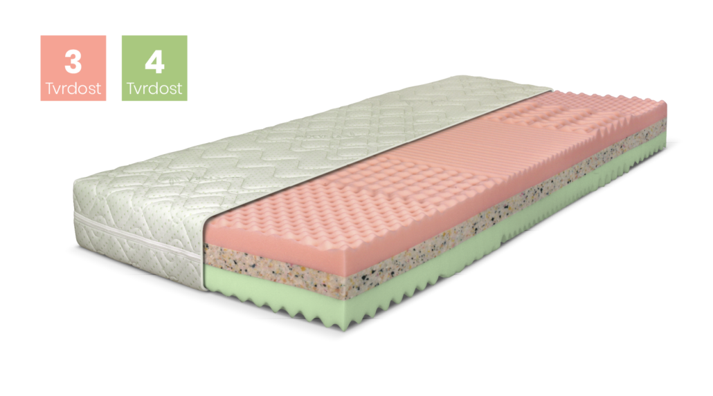 5zónová matrace. Mezi výrazně profilované vrstvy polyuretanové pěny je vložena deska z RE pěny, která zaručuje zvýšenou nosnost matrace. Odlehčení exponovaných míst na těle zřetelně zlepšuje prokrvení pokožky a uvolnění svalů.